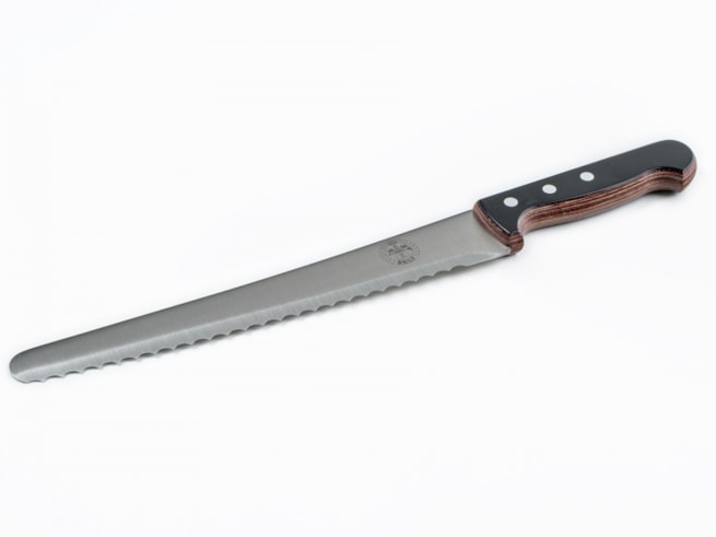 En brød og konditorkniv som er perfekt til å skjære baguetter, kakebunner, store runde brød og andre bakevarer. Skaftet er i materialet Polyoxymethylen og rosentre.
